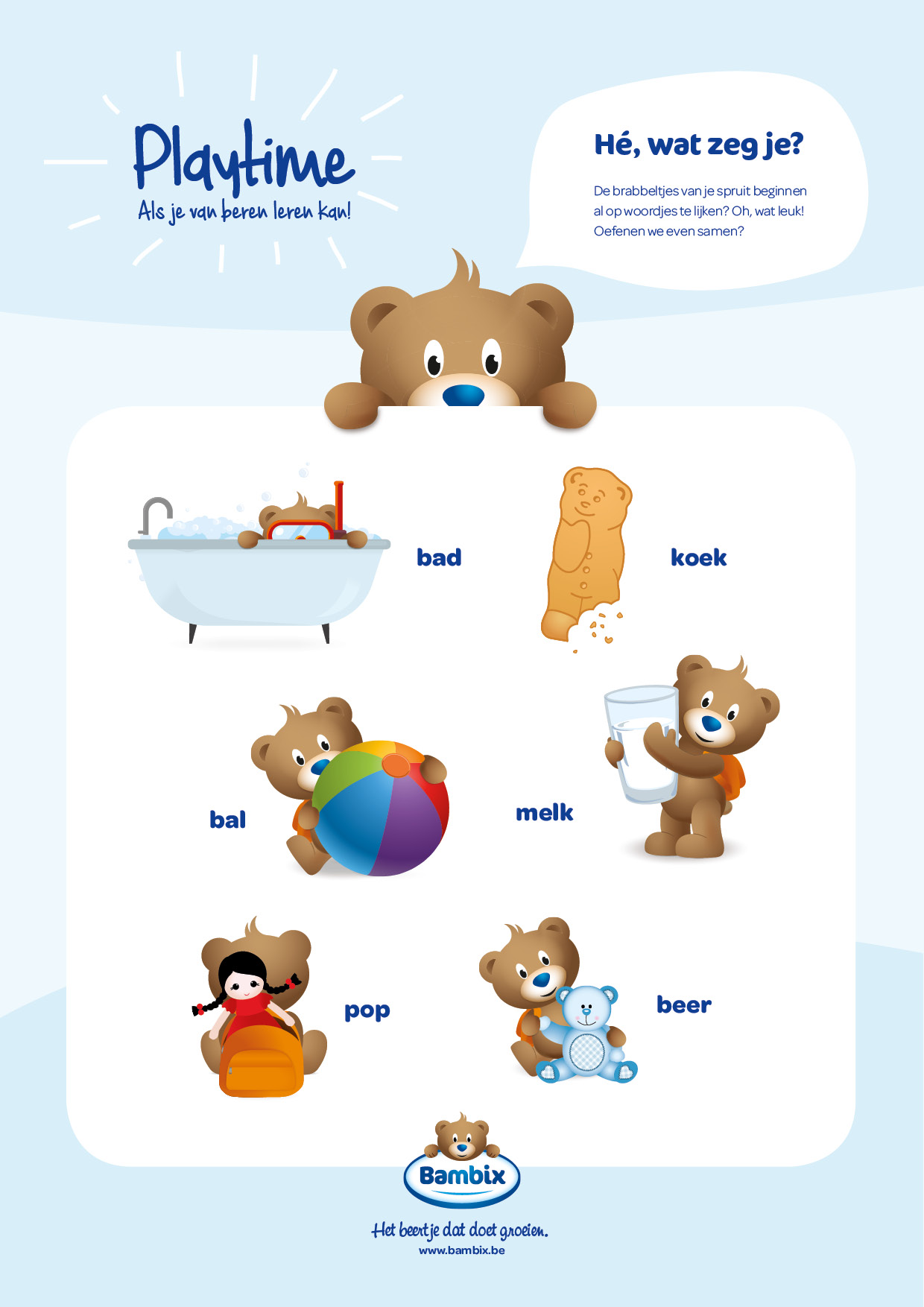 Het Bambix-beertje oefent graag enkele van je eerste woordjes met je.
