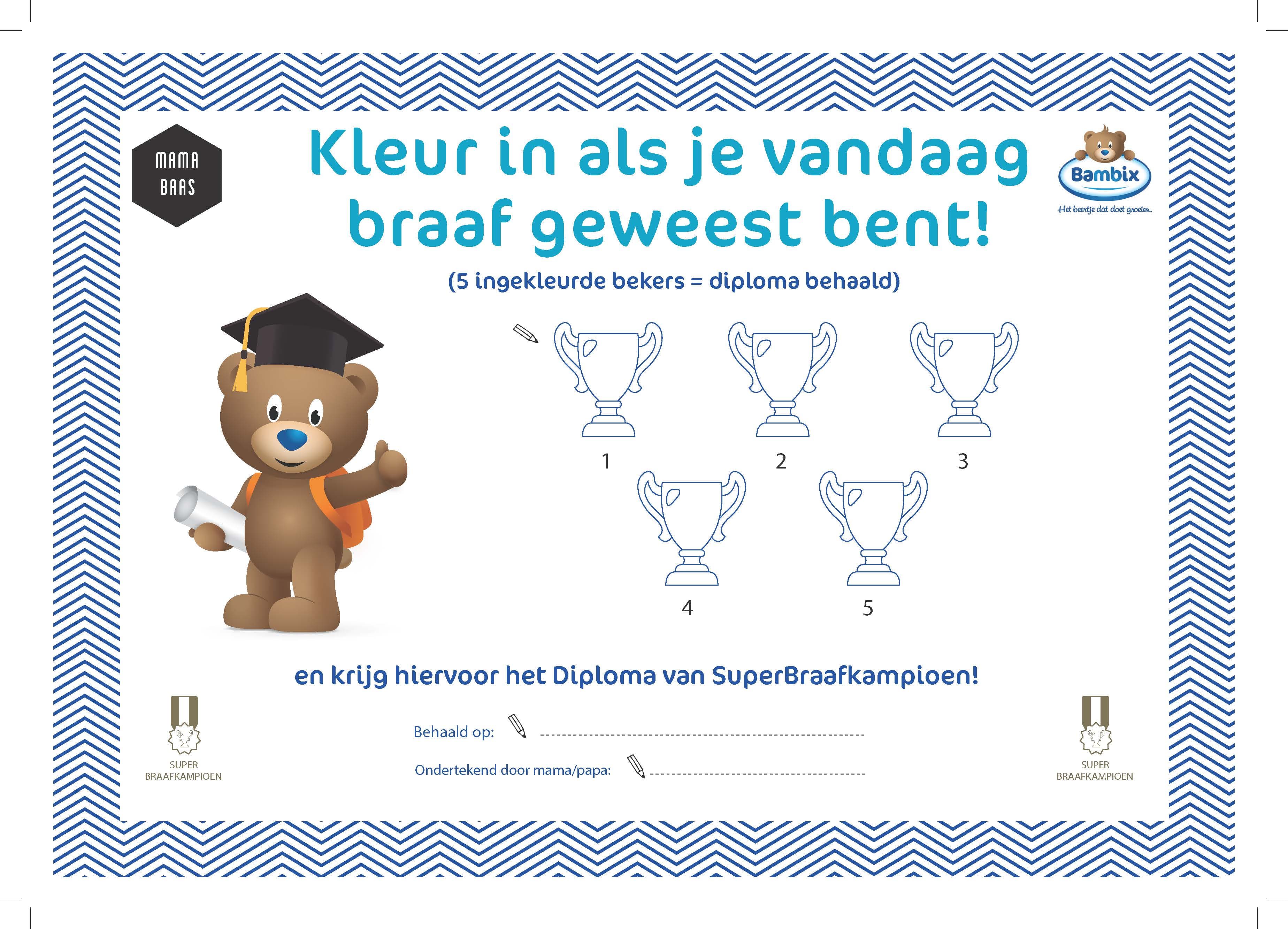 Print het uit en vul het samen met uw kind in wanneer hij/zij braaf is geweest. Na 5 ingevulde vakjes krijgt uw kind het diploma van SuperBraafkampioen.